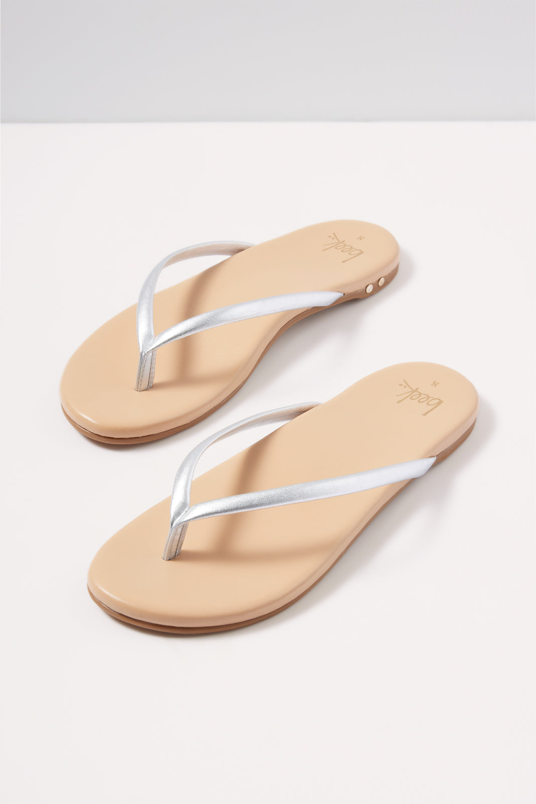 Add a hint of shine to your summer look with these metallic thong sandals by Beek, featuring a silver leather strap and memory foam footbed for day-to-night comfort.