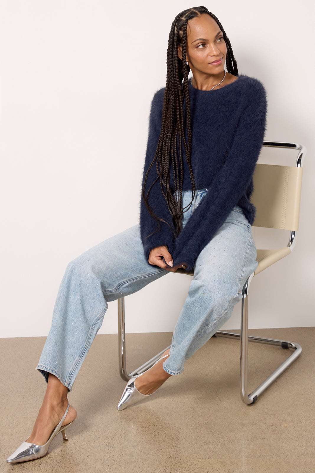 As cozy as it is chic, the Sylvie sweater by EVEREVE is crafted in a fuzzy eyelash knit and features a crew neckline, cropped length, and bell sleeves—perfect for wearing from day to night.