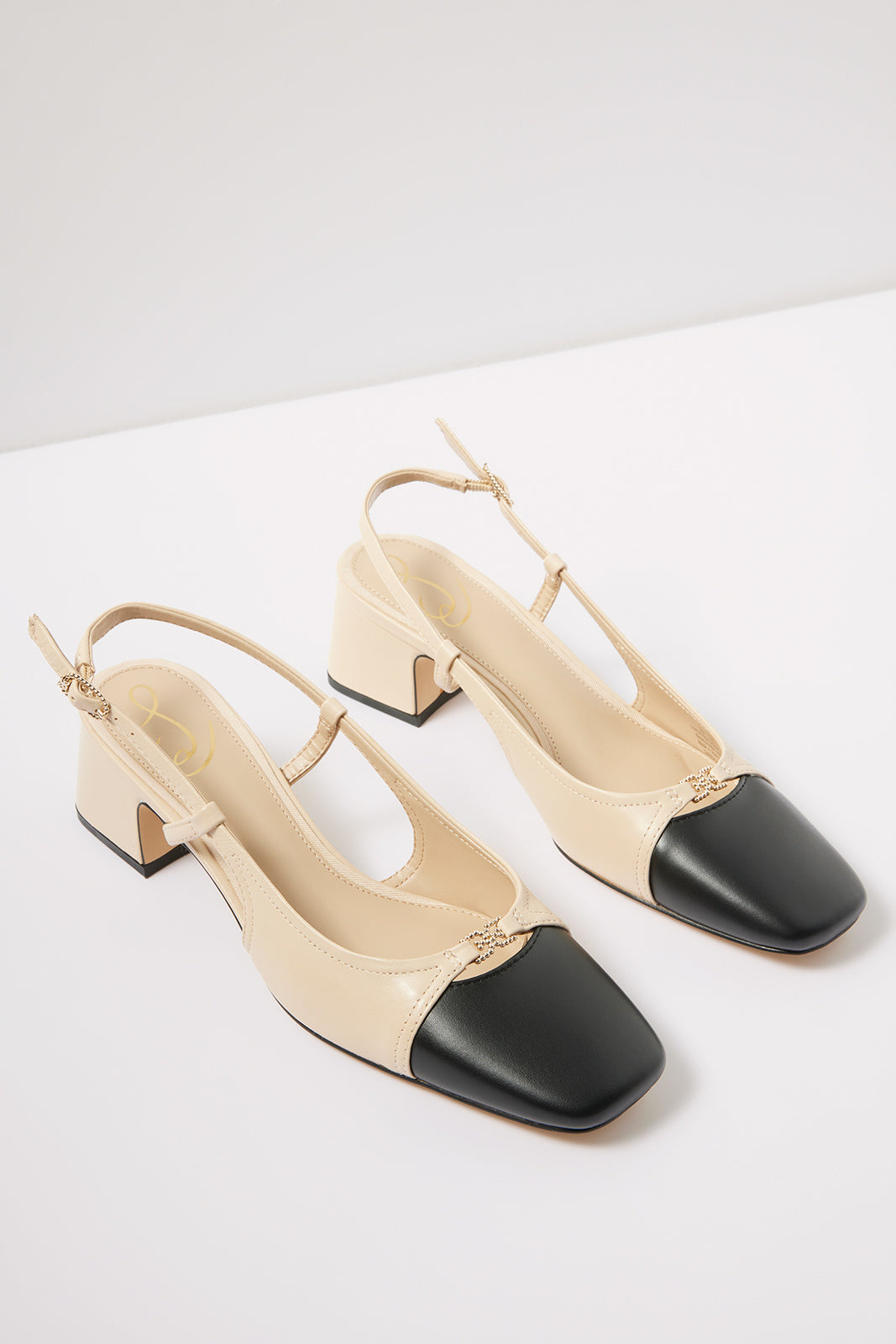 Effortlessly chic, these slingback pumps by Sam Edelman feature a stylish colorblocked design with a block heel, buckle closure, and square toe with a metal charm detail. Wear them with any look from dresses to trousers to wide leg jeans.