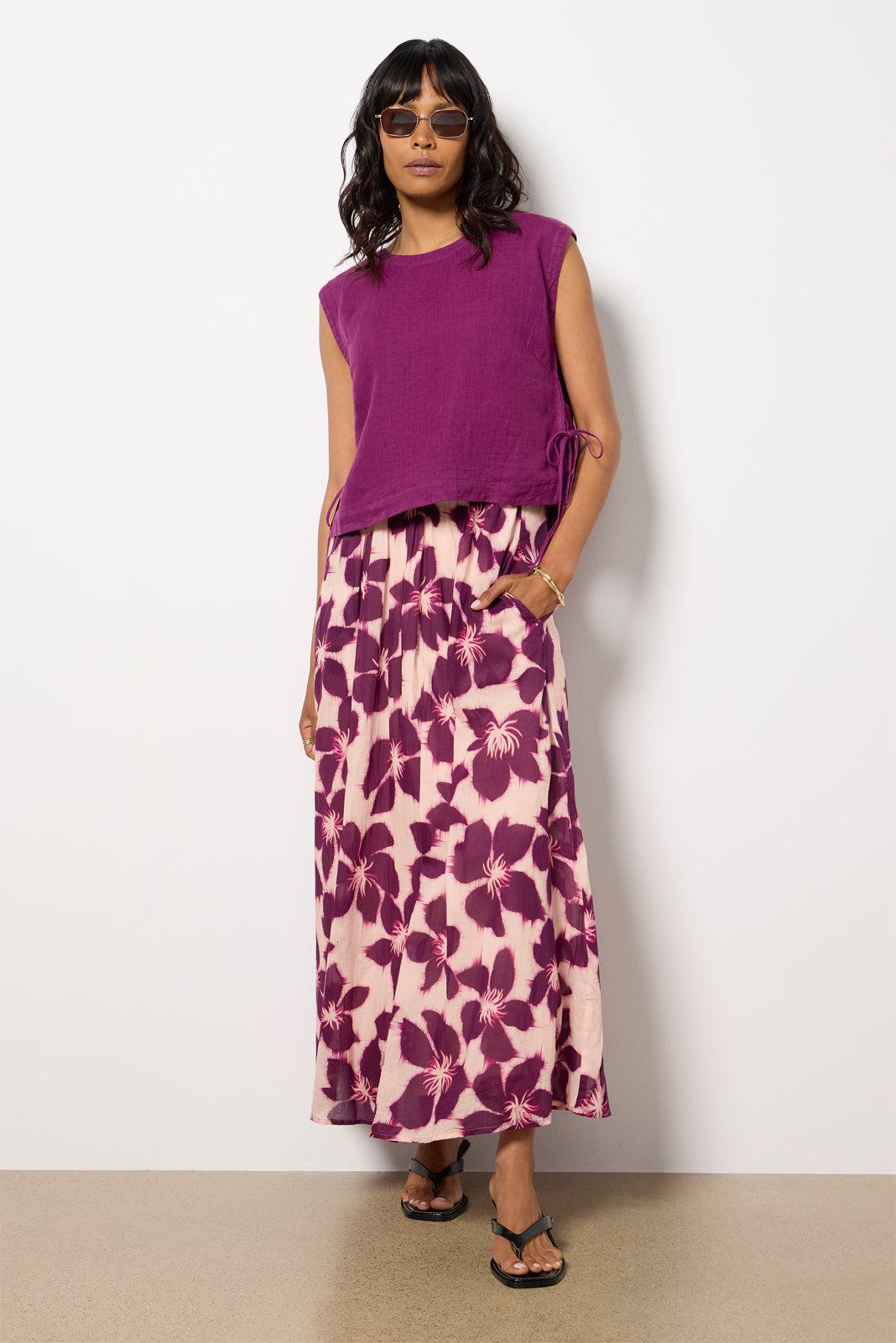 Perfect for summer, the Tavia linen top by Velvet features a relaxed, sleeveless silhouette with a back keyhole button closure, cropped fit, and side tie details for an elevated touch.