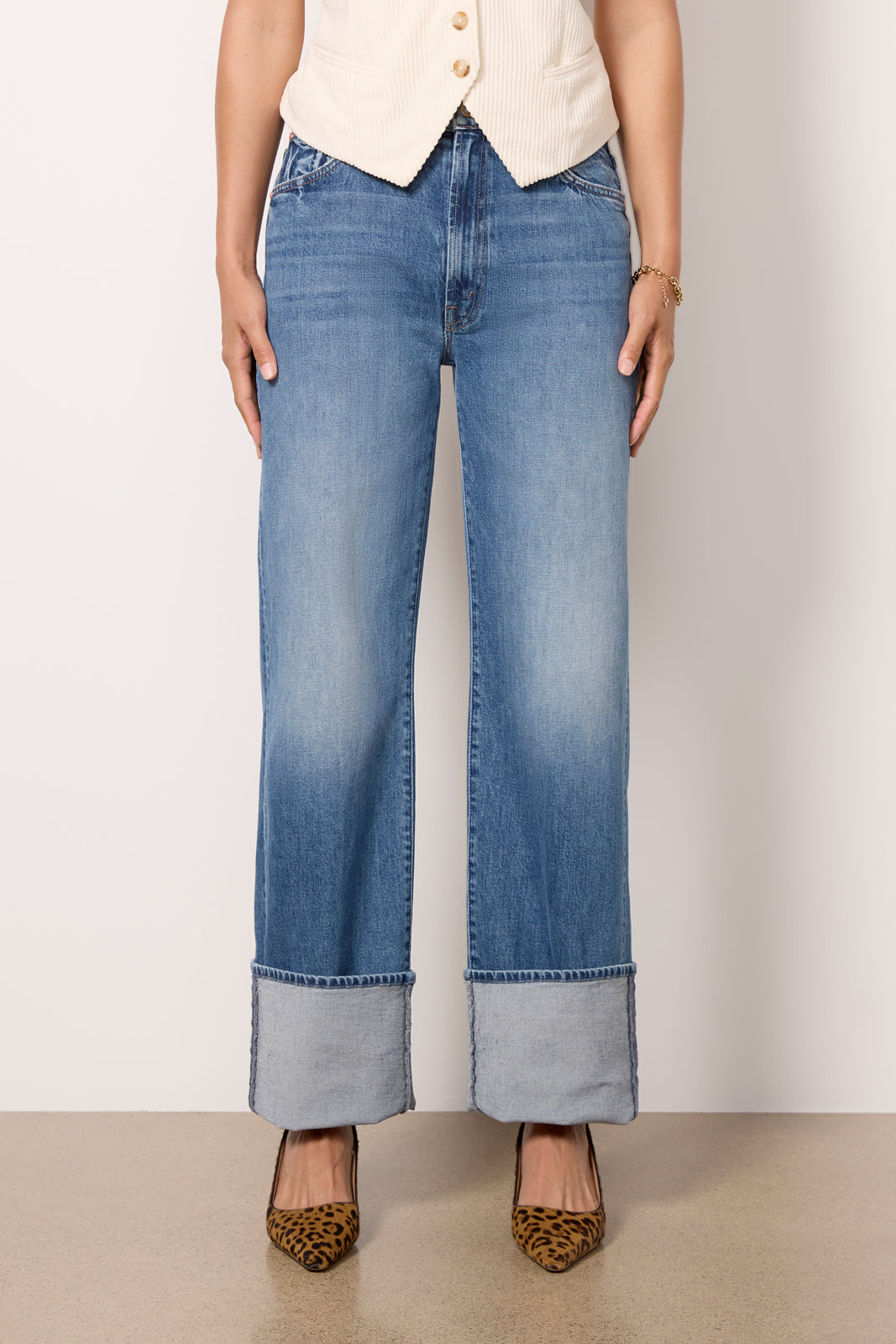 Elevate your denim collection with these wide leg jeans by MOTHER, featuring cuffed hems and a high-rise waist. Finished in a medium blue wash with fading at the knees, these jeans will take you from day to night in style.