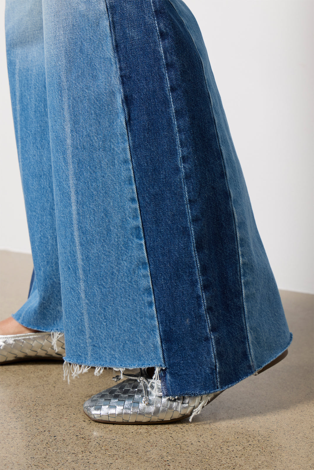 Add bold style to your denim collection with The Tux Sidestepper Sneak Fray jean by MOTHER. Designed with darker panels down the sides, these wide leg jeans are crafted in rigid cotton denim with a high-rise waist, full-length leg, and frayed uneven hems.