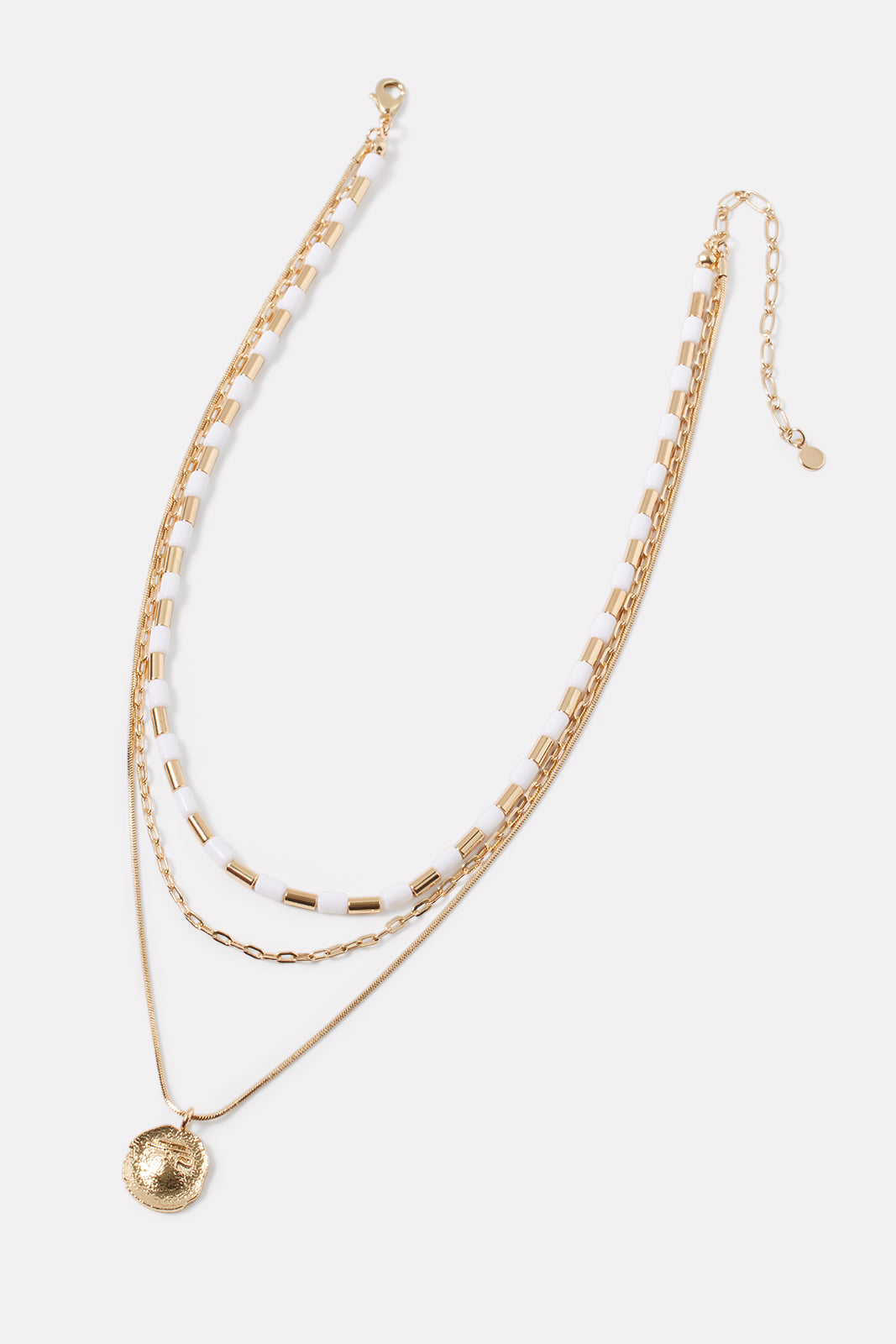 The Tia necklace by EVEREVE will be your go-to everyday accessory, featuring a triple strand design, hammered pendant, and gold plated finish.