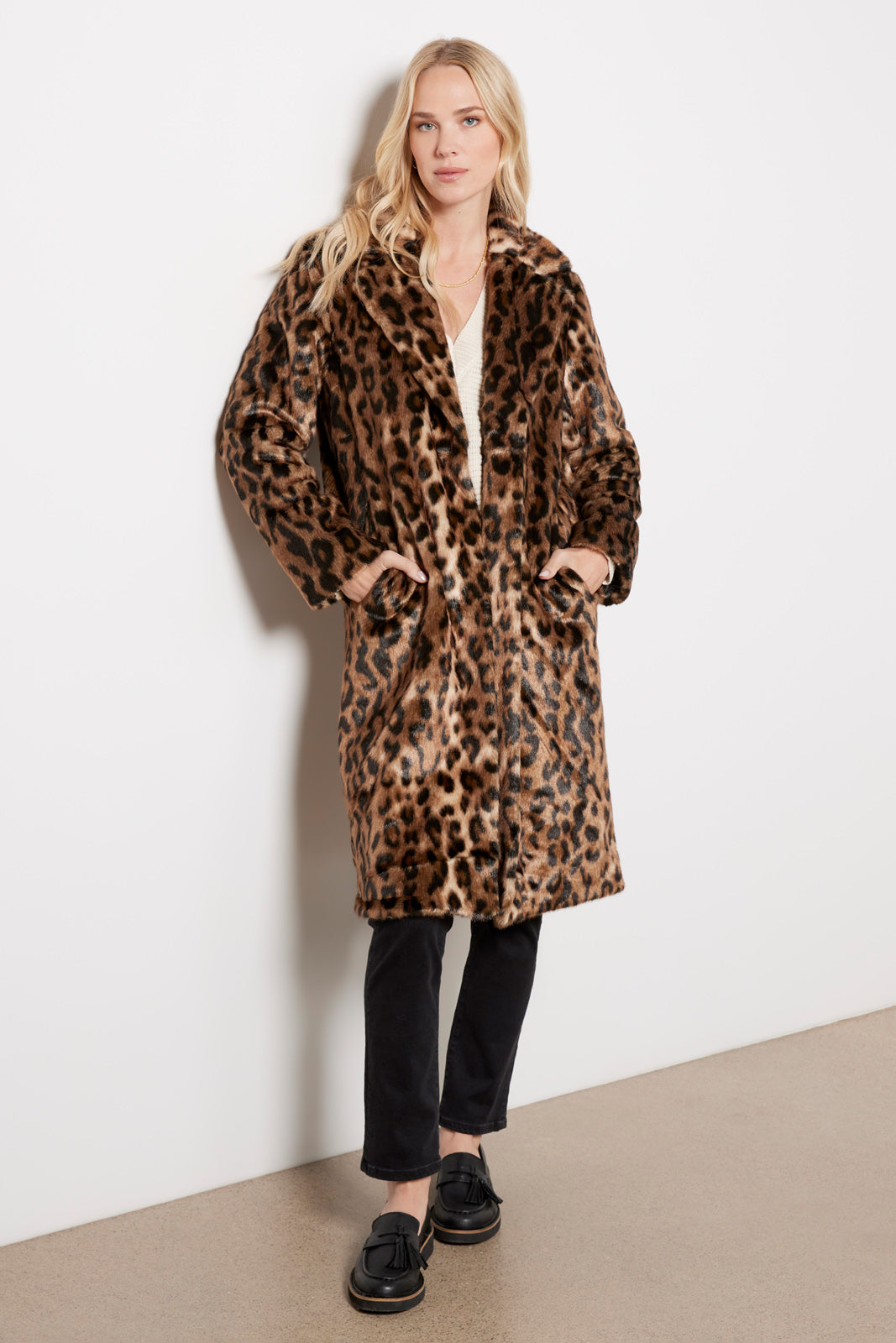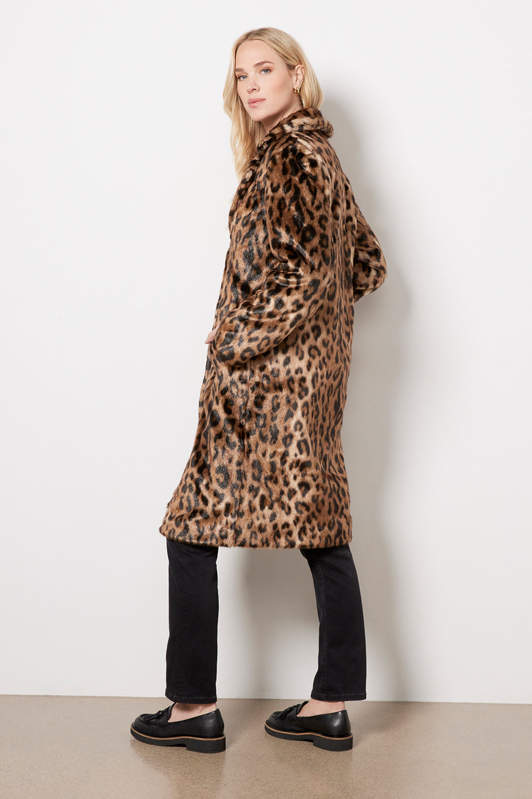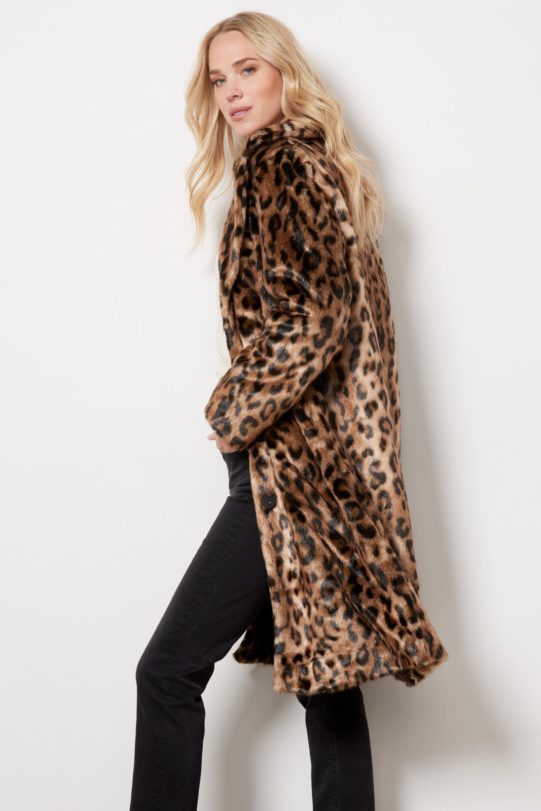 Crafted in a plush faux fur fabric, the Apparis Tikka Leopard Coat features a notch collar, a front button closure, and a relaxed mid-length silhouette finished with a soft feel.