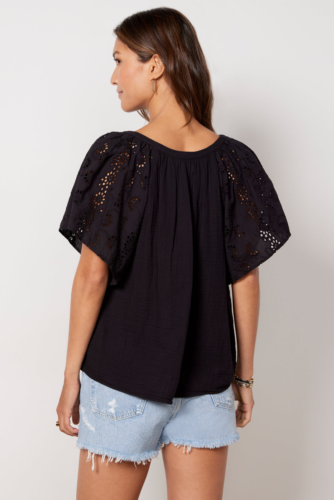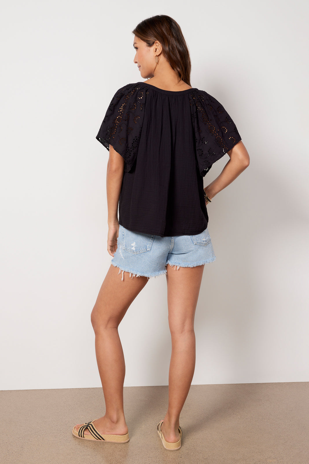Eyelet sleeves add an elevated, feminine feel to the Tish Top by Velvet, featuring a flowy, relaxed body in cotton gauze fabric. Tuck into cutoffs or cargo pants for a chic warm-weather look.