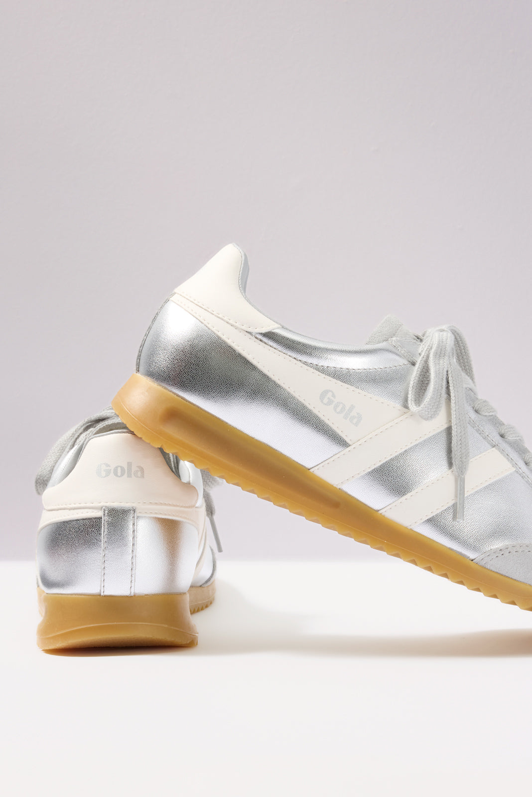 Make a statement with these sporty metallic sneakers by Gola, featuring an '80s-inspired silhouette with a silver leather upper and gum sole.