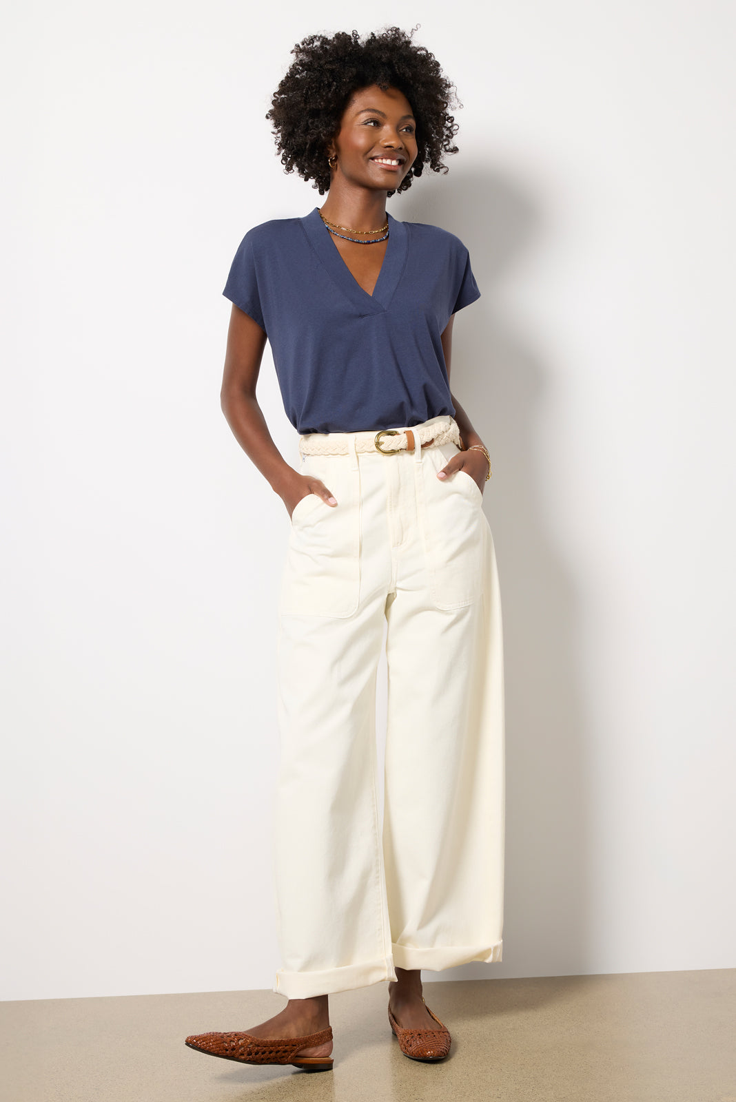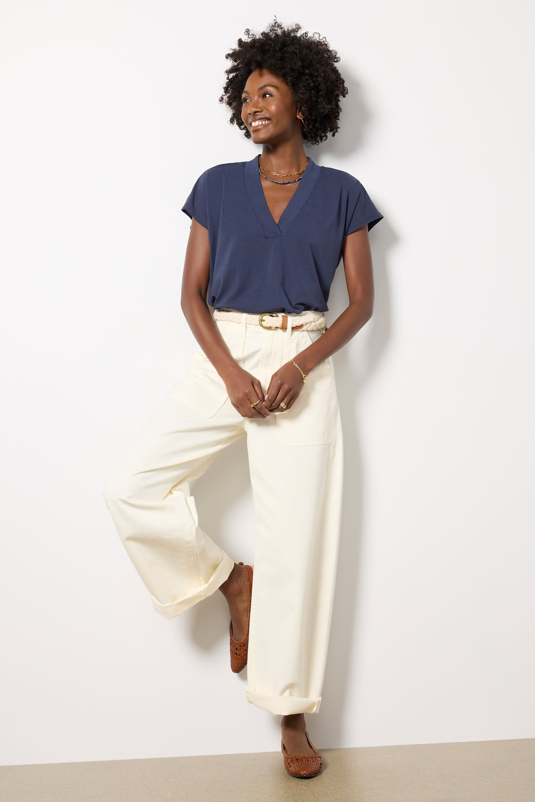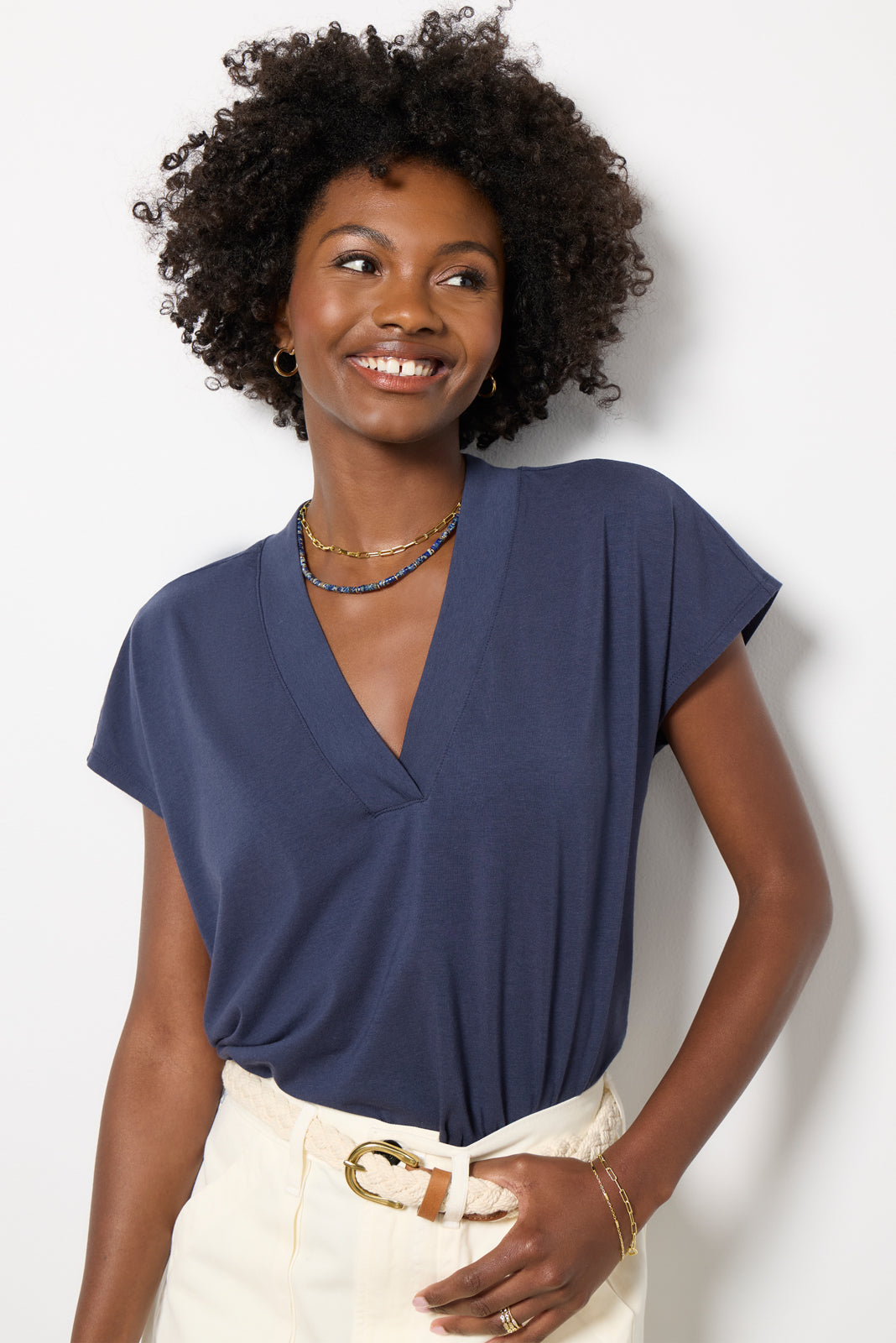 Effortlessly flattering, this perfect everyday tee by Bobi features a split v-neckline, short sleeves, and a classic fit.